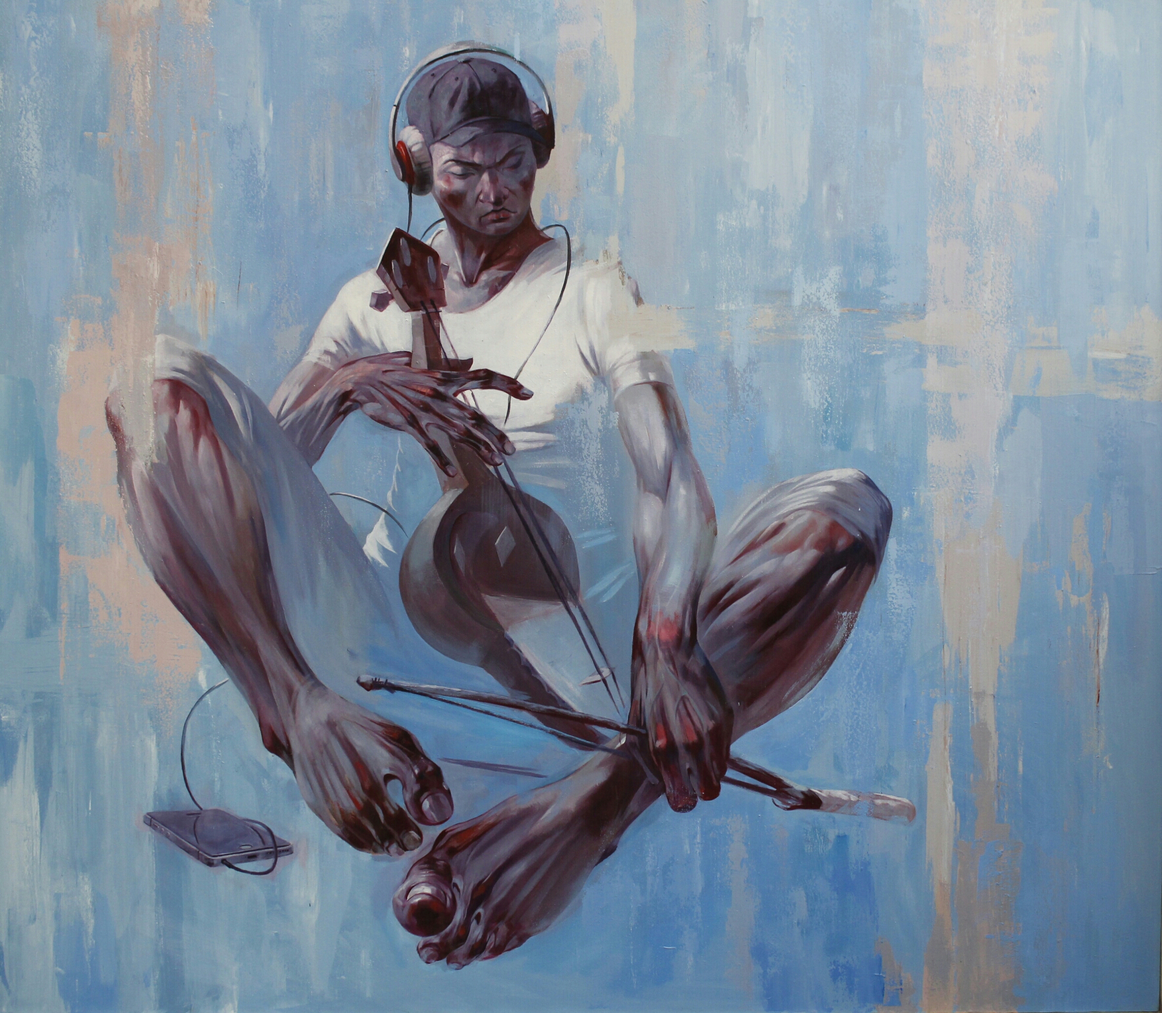 Кейіпкердің бет-әлпеті мұқият шоғырланған және музыканттың музыкамен тұтастай байланысқанын көрсетеді. Оның дене қалпы мен қолдарының қозғалысы қобызды шебер ойнап отырғанын айқындайды. Құлаққап арқылы музыка тыңдап, өз ойымен, сезімімен әуендетуі оның ішкі әлеміне терең үңілуіне мүмкіндік береді.